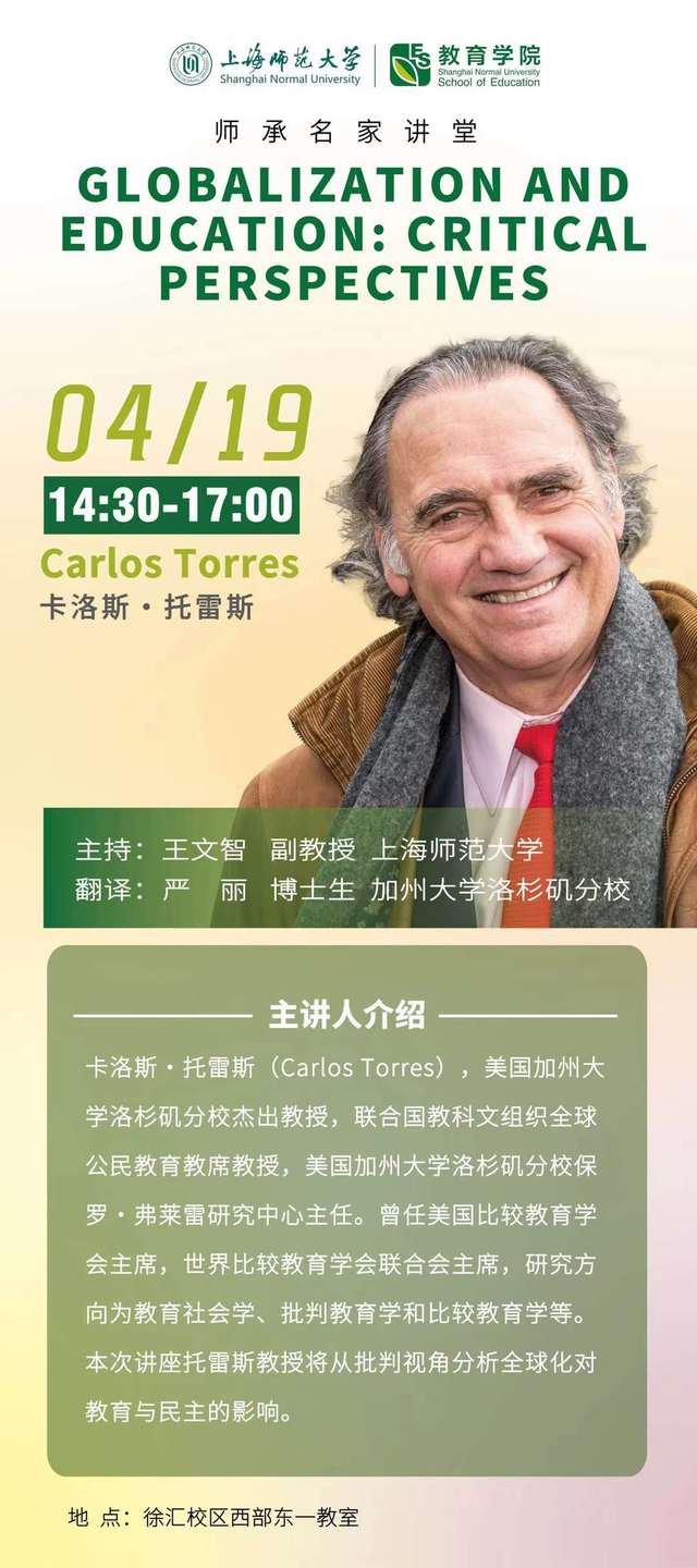 卡洛斯·托雷斯(Carlos Torres),美国加州大学洛杉矶分校杰出教授,联合国教科文组织全球公民教育教席教授,美国加州大学洛杉矶分校保罗·弗莱雷研究中心主任。曾任美国比较教育学会主席,世界比较教育学会联合会主席,研究方向为教育社会学、批判教育学和比较教育学等。本次讲座托雷斯教授将从批判视角分析全球化对教育与民主的影响。