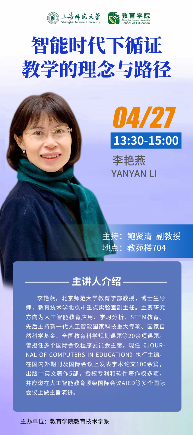 李艳燕,北京师范大学教育学部教授,博士生导师,教育技术学北京市重点实验室副主任。主要研究方向为人工智能教育应用、学习分析、STEM教育。先后主持新一代人工智能国家科技重大专项、国家自然科学基金、全国教育科学规划课题等20余项课题。曾担任多个国际会议程序委员会主席,现任《Journal of Computers in Education》执行主编。在国内外期刊及国际会议上发表学术论文100余篇,出版中英文著作5部,授权专利和软件著作权多项,并应邀在人工智能教育顶级国际会议AIED等多个国际会议上做主旨演讲。