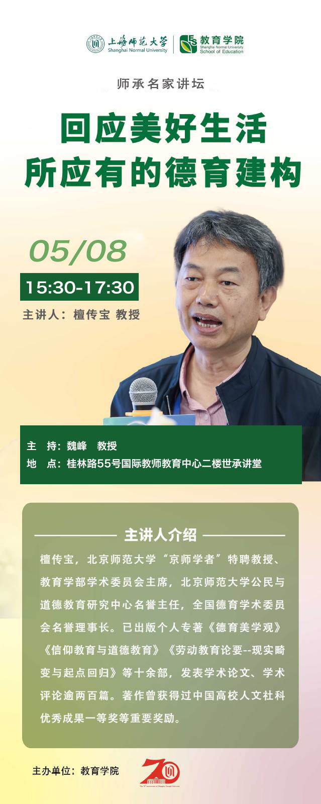 檀传宝,北京师范大学“京师学者”特聘教授、教育学部学术委员会主席,北京师范大学公民与道德教育研究中心名誉主任,全国德育学术委员会名誉理事长。已出版个人专著《德育美学观》《信仰教育与道德教育》《劳动教育论要--现实畸变与起点回归》等十余部,发表学术论文、学术评论逾两百篇。著作曾获得过中国高校人文社科优秀成果一等奖等重要奖励。