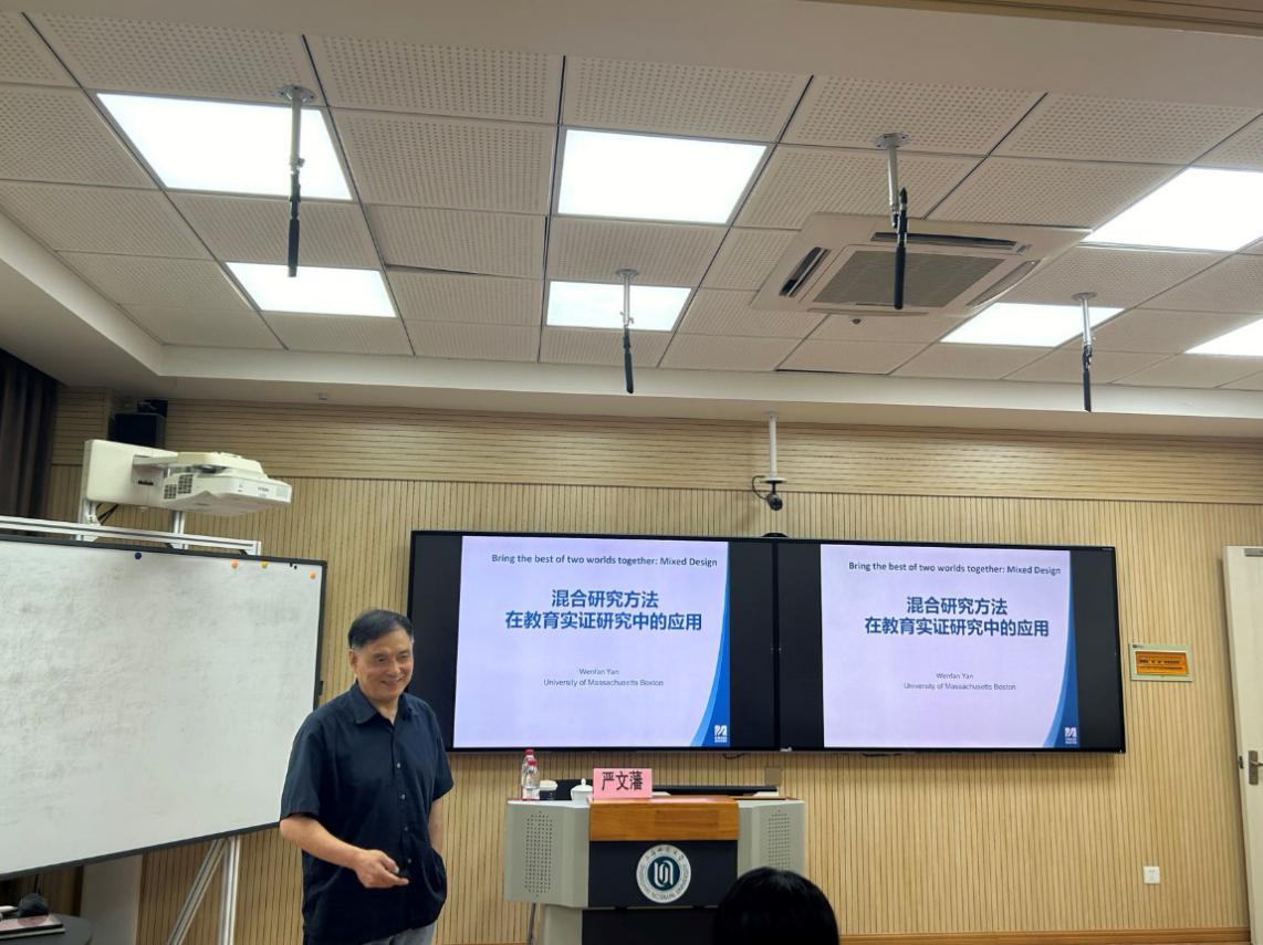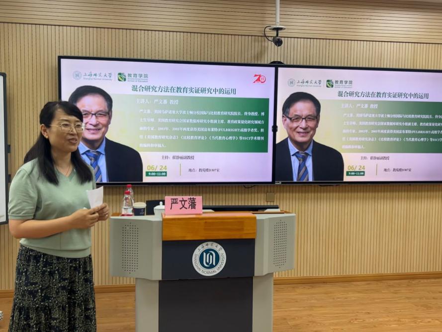 2024年6月24日上午9点,美国马萨诸塞大学严文蕃教授受邀在教苑楼D307会议室为我院师生带来题为“混合研究方法在教育实证研究中的运用”的主题报告。此次讲座由太阳集团9728翟静丽副教授主持,太阳集团9728副院长魏峰教授及二十余名博士、硕士研究生参与了本场活动。