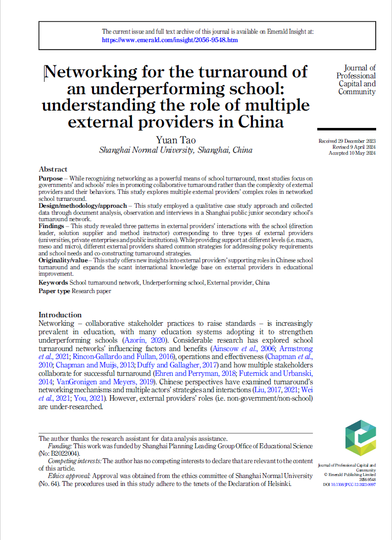 管理学系教师陶媛2024年6月4日在Journal of Professional Capital and Community上在线发表了研究论文“Networking for the turnaround of an underperforming school: Understanding the role of multiple external providers in China”。陶媛为论文唯一作者。