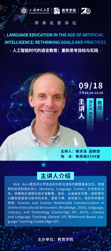 Rick Kern是加州大学伯克利分校法语系的教授兼系主任。他曾担任伯克利语言中心(Berkeley Language Center)主任长达16年。他教授的课程包括外语教育、语言、法语语言学等。他的研究兴趣包括语言与技术的关系、语言习得、读写能力。他的学术著作包括:Screens and Scenes: Multimodal Communication in Online Intercultural Encounters (Routledge, 2018), Language, Literacy, and Technology (Cambridge UP,2015),Literacy and Language Teaching (Oxford UP) 和Network-Based Language Teaching (Cambridge UP)。