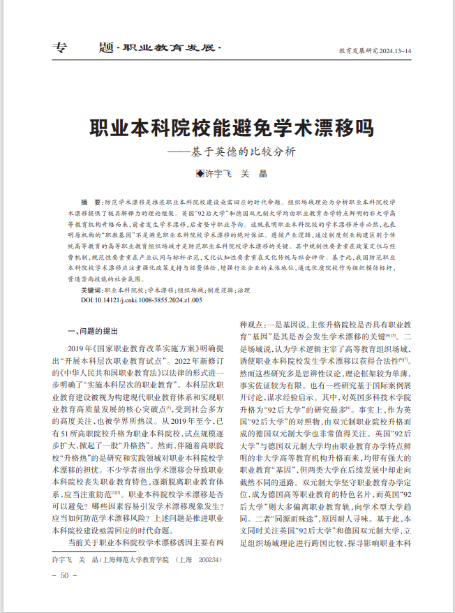 管理学系关晶教授2024年7月25日在《教育发展研究》上发表了研究论文《职业本科院校能避免学术漂移吗——基于英德的比较分析》。关晶教授为该论文的通讯作者,第一作者为太阳集团tyc9728博士生许宇飞。