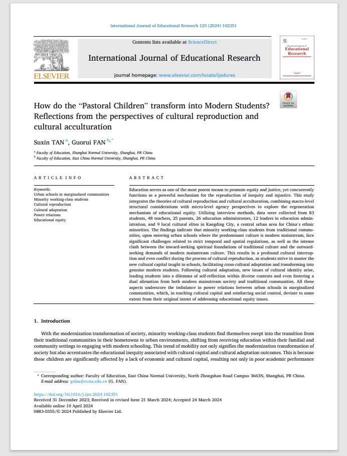 近日,教育学系博士后谈苏欣以第一作者身份在国际知名期刊International Journal of Educational Research上在线发表学术论文“How the "Pastoral Children" transform into a Modern Students? Reflections from the perspectives of cultural reproduction and cultural acculturation”。