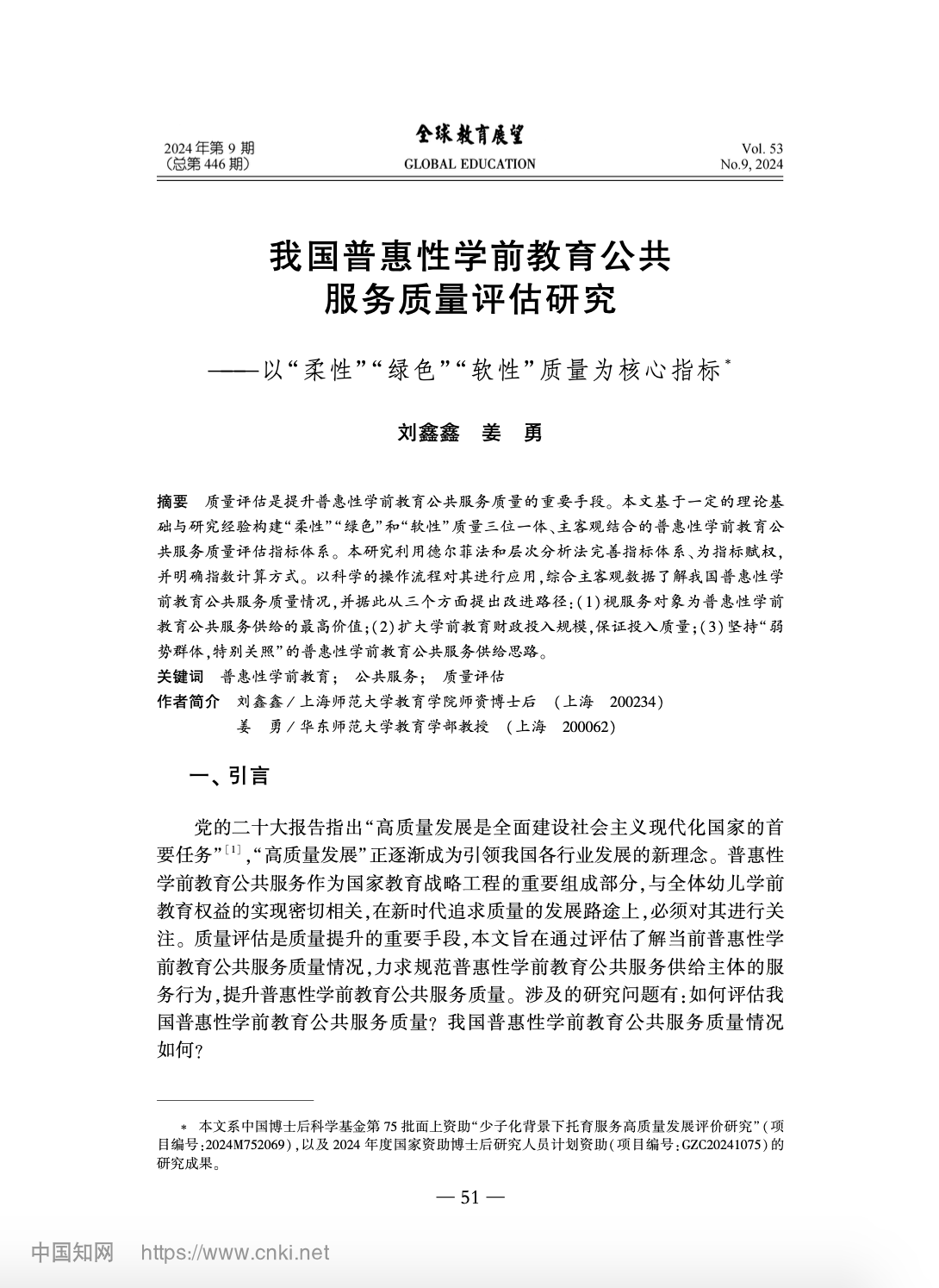 教师发展中心师资博士后刘鑫鑫2024年9月10日在《全球教育展望》上发表了研究论文《我国普惠性学前教育公共服务质量评估研究——以“柔性”“绿色”“软性”质量为核心指标》。刘鑫鑫为该论文的第一作者,第二作者为华东师范大学姜勇教授。