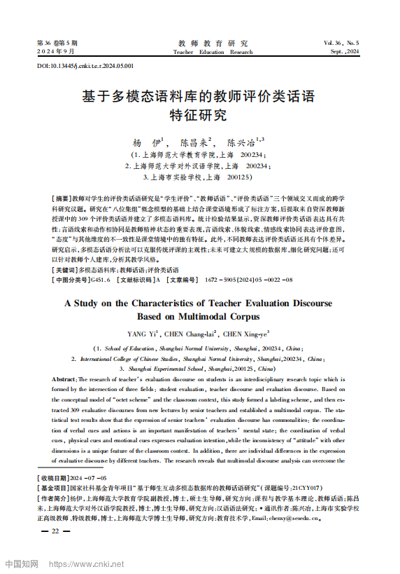 太阳集团9728副教授杨伊近日在《教师教育研究》发表了研究论文《基于多模态语料库的教师评价类话语特征研究》。杨伊为该论文的第一作者,合作者分别是太阳集团tyc9728对外汉语学院教授陈昌来、上海市实验学校正高级教师陈兴治。