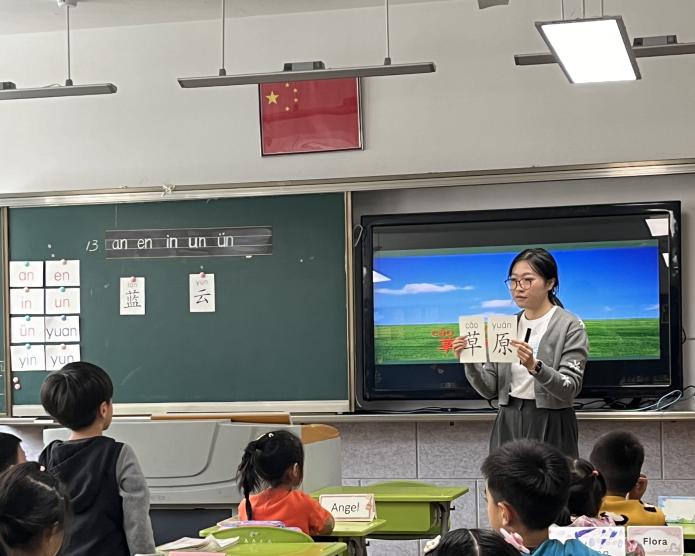 2021级文科班本科生尹紫莛同学展示了小学语文一年级课程《an、en、in、un、ün》的教学。尹紫莛同学由上堂课学习过的五个前鼻韵母和三个整体认读音节入手带领学生进行复习回顾,再通过朗读以及借助插图联想和连线游戏的方式让学生掌握“蓝天白云草原森林”四个词,最后教会学生们朗读儿歌并体会其情感表达。她不仅将知识与生活实际相连,还运用了多种教学方法,使课堂丰富多彩。2021级理科班本科生谢佳仪同学展示了小学三年级课程《数学广场--周期问题》。谢佳仪同学结合具体情境,引领学生们探索并发现简单周期现象中的排列规律,正确计算按周期规律排列的某类物体或图形的总个数。在让学生们在画图、例举、计算等不同策略中解决周期问题,知晓了使用除法解决这类问题的便捷。
