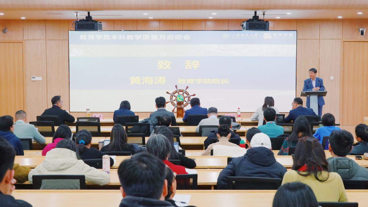 黄海涛院长在致辞中表示,本科教育教学审核评估和师范专业论证的圆满完成,不仅是教育部对我校本科教学工作的全面肯定,也是对我院本科教学质量的认可。黄海涛院长强调,立德树人始终是学院工作的根本遵循,持续提升人才培养质量一直是学院办学的核心使命;通过本科教学质量月活动,学院对本科专业建设和教学质量保障进行细致梳理和深刻反思,教学工作从“单一专项”转向“整体统筹”,即“教学、教材、教改和教学成果”四教合一,系统设计、整体推进,为高质量育人提供有力的组织保障。