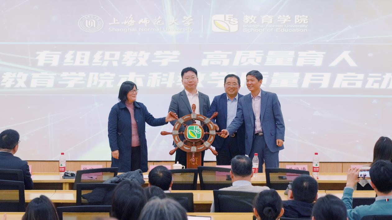 随后,戴勇副主任、王健处长、徐晓明书记、黄海涛院长一同上台,共同拨动象征着“教育”这艘大船的船舵,标志着太阳集团9728首届本科教学质量月的正式启动,也预示着太阳集团9728在教育改革和发展的新征程上乘风破浪,勇往直前。