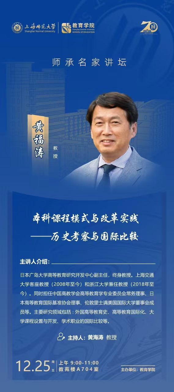 主讲人黄福涛,日本广岛大学高等教育研究开发中心副主任,终身教授。上海交通大学客座教授(2008年至今)和浙江大学兼任教授(2018年至今)。同时担任中国高教学会高等教育学专业委员会常务理事、日本高等教育国际基准协会理事、伦敦里士满美国国际大学董事会成员等。主要研究领域包括∶外国高等教育史、高等教育国际化、大学课程设置与开发、学术职业的国际比较等。