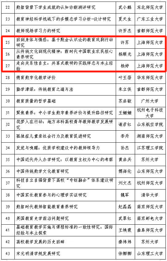 我院许苏老师、杨婷老师和杨顺光老师成功获批3项国家社科基金后期资助项目。本次国家社会科学基金后期资助项目中教育学科共有46项,我院获批3项,这一成绩在全国高校教育学科中名列前茅,彰显了我院在教育学领域的研究实力。