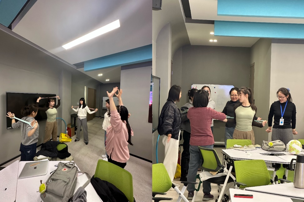 此外,体育专业的研究生还现场为老师们带来了别开生面的拉力带用法体验活动,详细地讲解并亲身示范拉力带的多种使用方式,从简单的拉伸动作到具有一定难度的力量训练动作,老师们纷纷踊跃参与,认真学习。一位参与体验的老师感慨道:“今天的互动游戏环节太有趣了,不仅让我们放松了身心,还在游戏中体会到了团队协作的重要性。尤其是拉力带的体验,让我了解到了新的健身方法,对今后保持健康的生活方式很有帮助,这样的活动真的很有意义!”