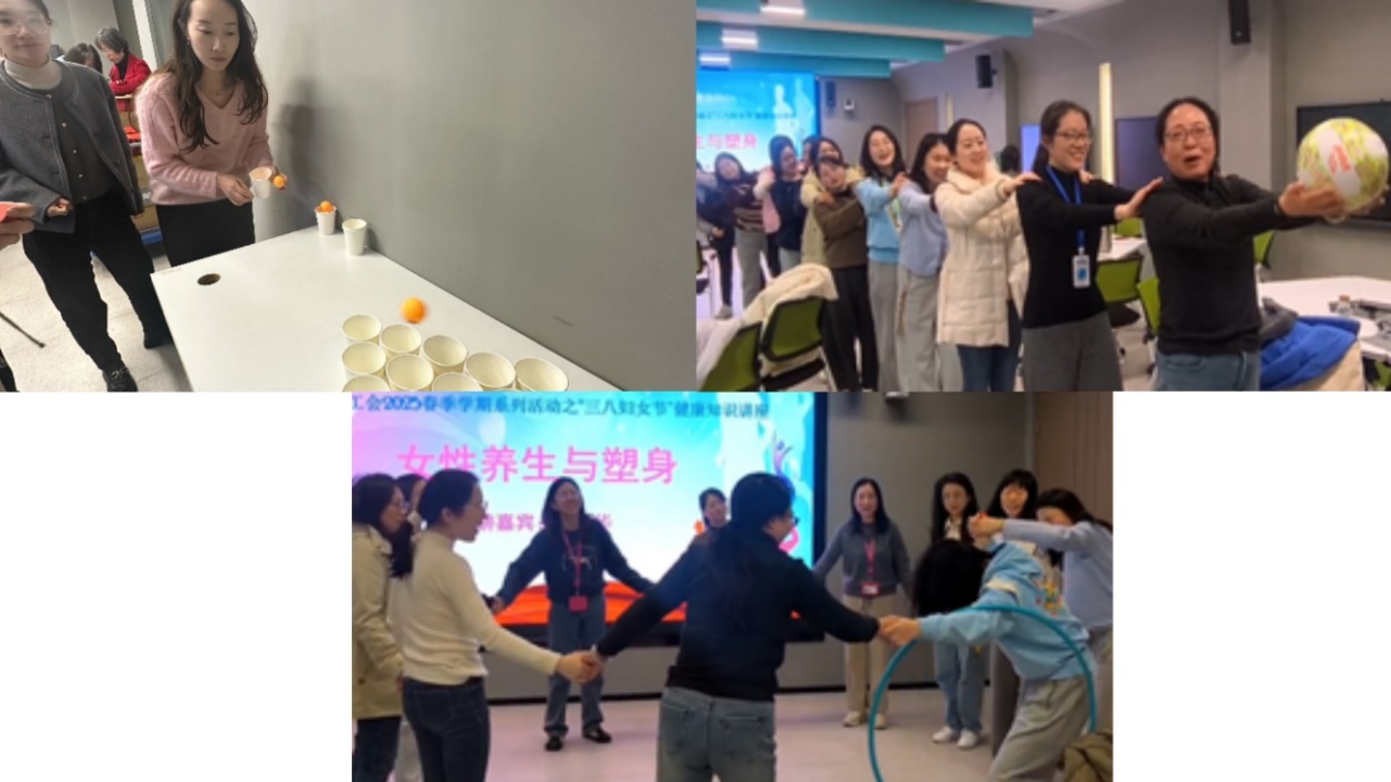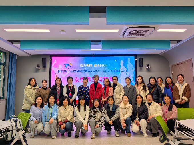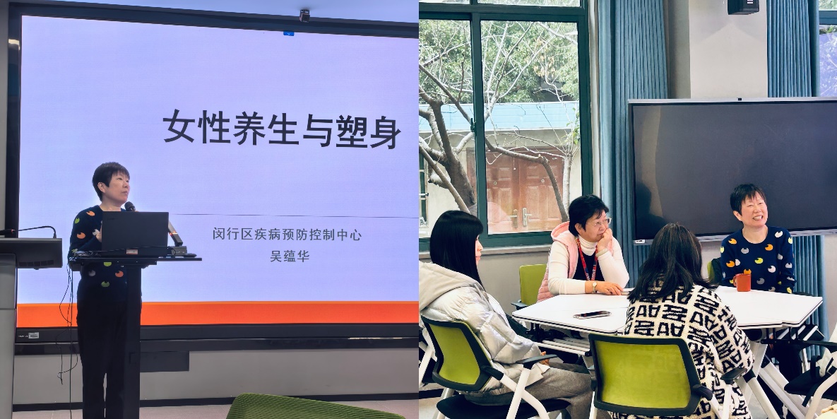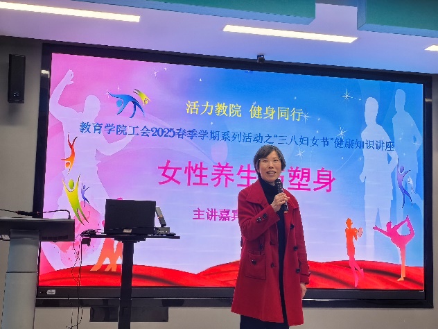 随后活动进入到备受期待的讲座环节。学院特别邀请了闵行区疾病预防控制中心吴蕴华专家,围绕女性养生与塑身展开了一场内容丰富的知识分享。一方面深入讲解养生的内涵,强调规律生活对维持身体健康的重要性,详细分享了保证睡眠、合理饮食、适当补水、规律排便等养生妙招。在塑身方面则着重介绍了控制饮食和有氧运动的关键作用,推荐了步行、慢跑、游泳等多种适合女性的有氧运动形式,并讲解了运动的注意事项,讲座最后与在场老师进行了热烈的互动,让女教职工们受益匪浅。