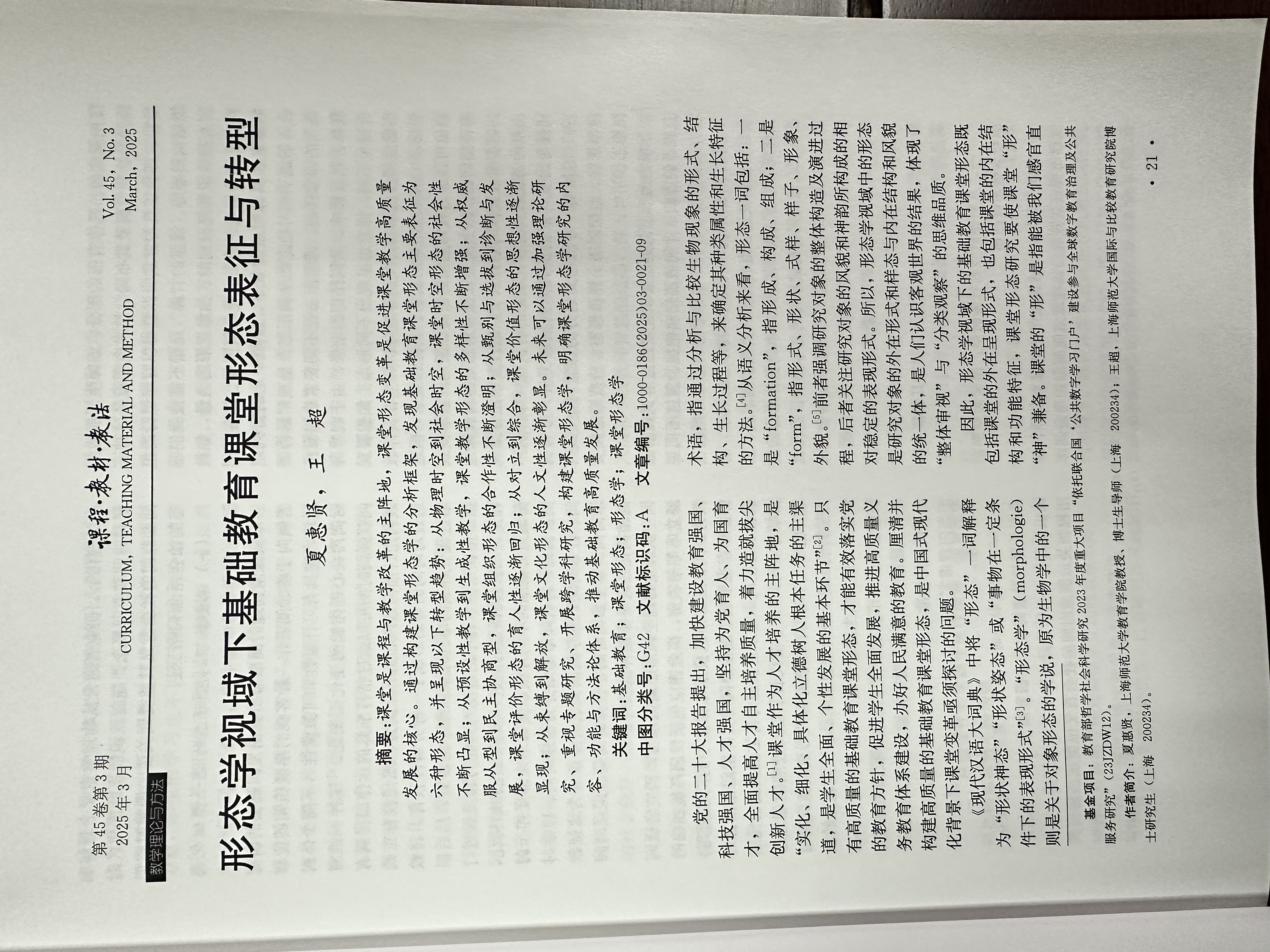 近日,教育学系夏惠贤教授在《课程·教材·教法》上发表了题为《形态学视域下基础教育课堂形态表征与转型》的学术论文。该期刊由教育部主管,在国内教育研究领域享有较高的学术声誉和广泛的学术影响力,被学校列为B类期刊。夏惠贤教授为论文的第一作者,太阳集团tyc9728博士生王超为第二作者。