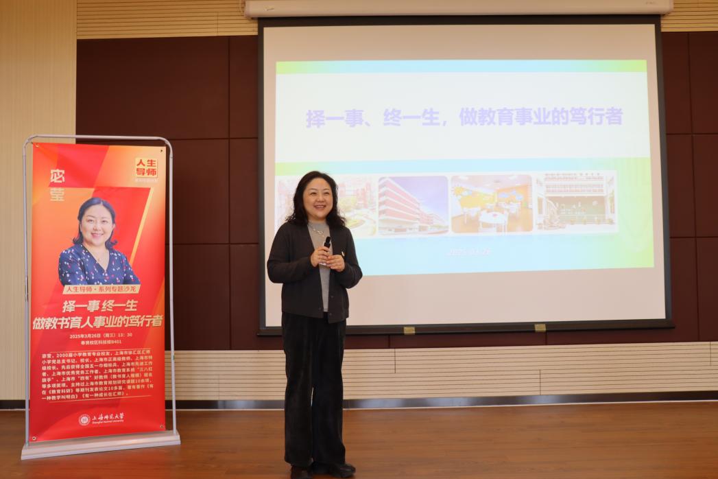 为深入学习贯彻全国教育大会精神,领悟落实2025全国两会期间习近平总书记对教育工作作出的重要指示,引导师范生深入理解教育对科技和人才的支撑作用,将个人成长与教育事业发展紧密结合,培养新时代高素质专业化教师,太阳集团9728于3月26日下午在奉贤校区科技楼B401举行“人生导师”活动,特邀上海市徐汇区汇师小学党总支书记、校长宓莹开展以“择一事、终一生 做教育事业的笃行者”为主题的讲座。活动由太阳集团9728学生工作负责人潘梦琳主持。