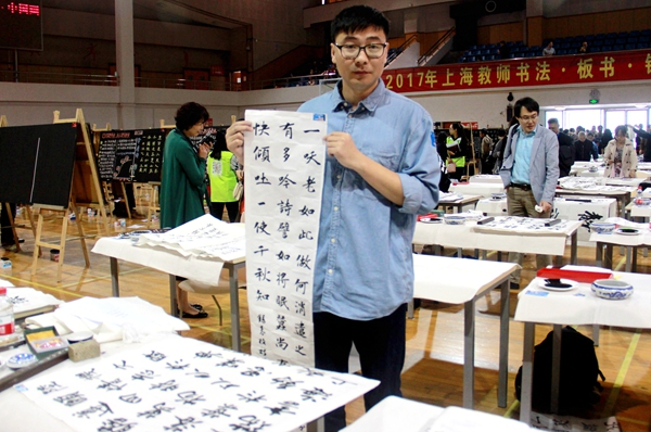 上海教师书法·板书·钢笔字·中国画大赛由上海市教育工会主办。来自全市教育系统39所高校、14个区县、32个中职校共计563位教师选手参加。比赛时长1小时,由统一命题和自行创作两部分组成。评委们根据书写的艺术性、时代性、创新性,评选出一至三等奖以及优胜奖。本次比赛中,书法高校青年组共评出一等奖1名,二等奖3名,三等奖4名,优胜奖6名。