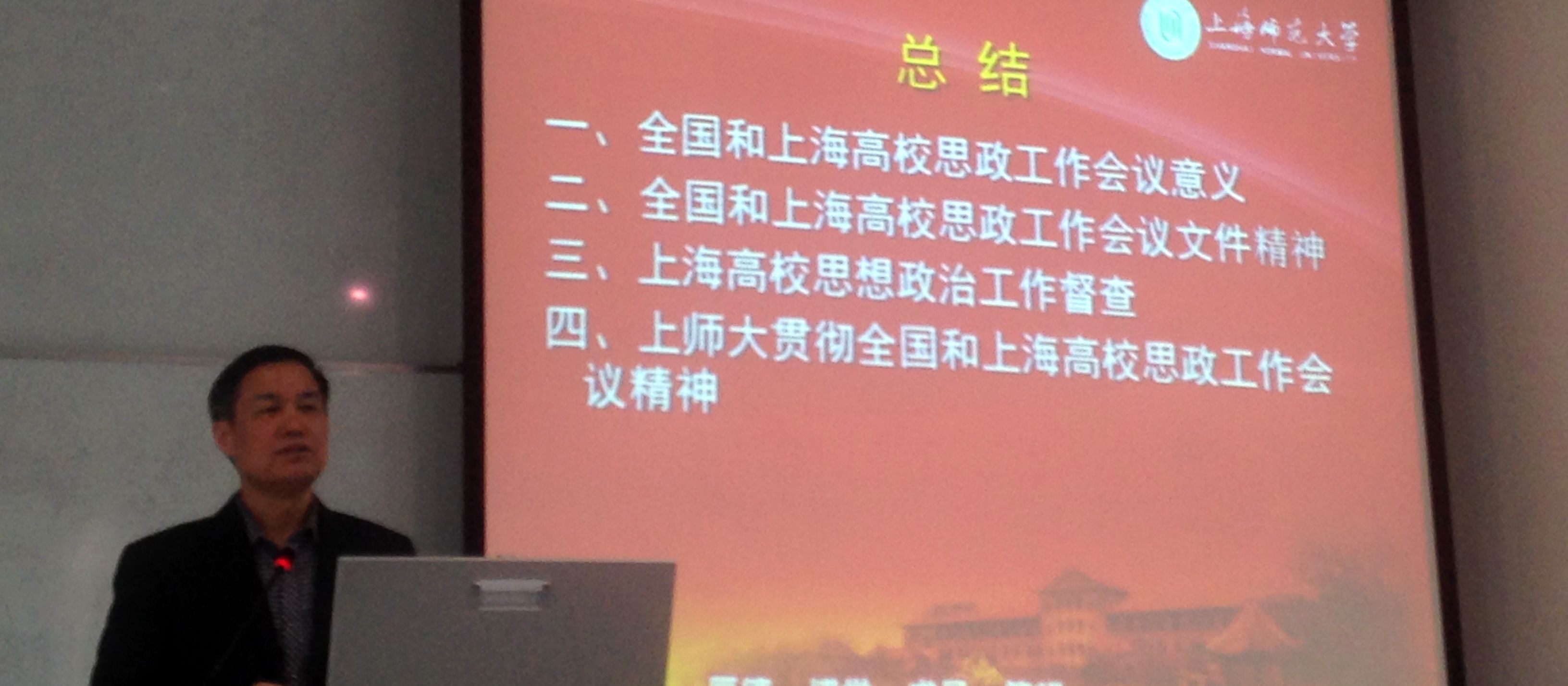 4月26日下午,太阳集团9728召开党员学习会,学习贯彻落实全国、上海和我校高校思想政治工作会议精神。会议邀请全国教学名师、我校马克思主义中国化理论课教师汪青松教授作题为“全员全方位全过程加强高校思想政治工作”的专题报告。报告会由学院党委书记徐晓明主持。