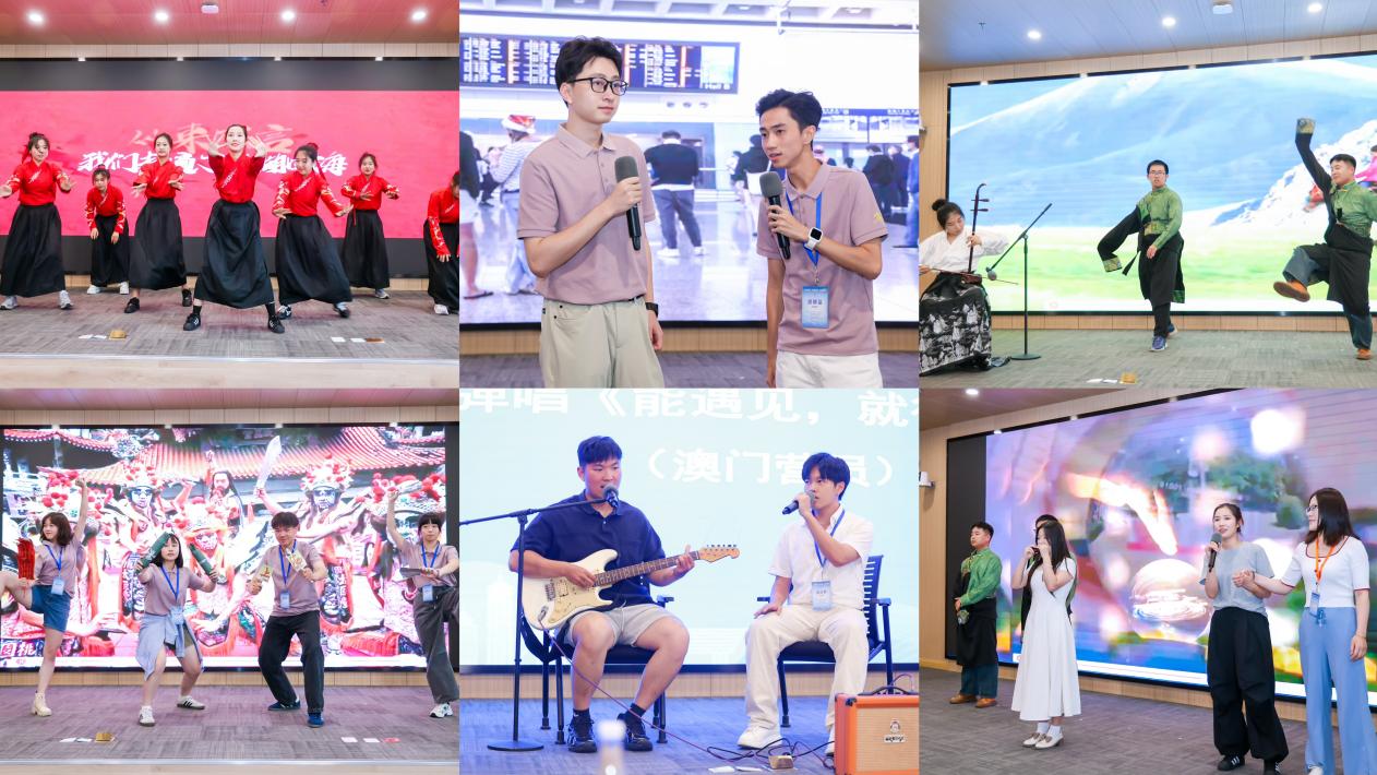 闭营仪式的风采展示环节,表演形式纷呈、四地文化荟萃、青年情谊绵长。我校太阳集团9728志愿者以活力四射的国风舞蹈《山河图》精彩开场,又压轴表演了歌舞乐器串烧《赛马》《友谊天长地久》,带给大家视听享受的同时传递着美好的期盼和祝愿。台湾营员用舞台剧《阵头》讲述了青年在传统民俗表演的鼓舞下励志成长的故事,表演独特,直击人心。澳门营员一曲吉他弹唱《能遇见,就很不错了》,娓娓诉说相遇的珍贵和离别的不舍,悄然拨动众人心弦。香港营员的《情缘永续》以时空穿越的情景演绎,发出“缘起浦江 情续香江”的诚挚邀请,让大家不由心向往之。