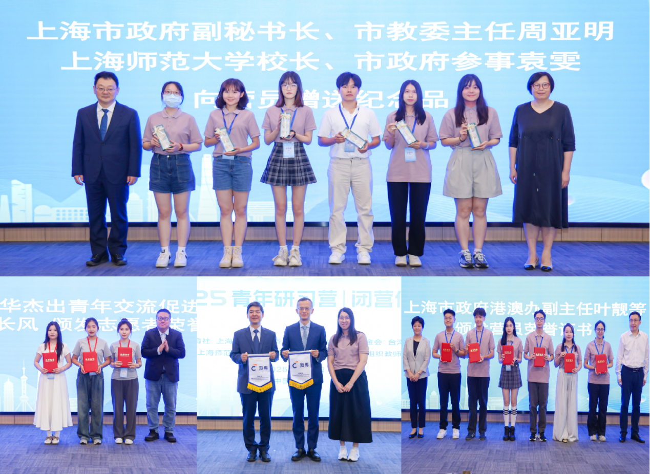 仪式上,周亚明、袁雯代表上海主办方向港澳台营员代表赠送纪念品。香港专业进修学校学生发展部主任王志雯代表港澳台方向丁祖昱、黄海涛回赠情谊之礼,象征着沪港澳台继续同心携手、共促合作的美好意愿。叶靓等为营员代表颁发营员荣誉证书,陈长风为志愿者代表颁发志愿者荣誉证书,表彰大家在研习营期间的优秀表现和担当作为。