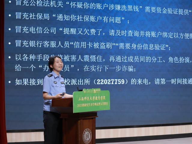 随后,文保分局沪西高校派出所张程梅子警官开展了安全教育,结合典型案例,详细讲解了防范电信诈骗及消防、网络安全知识,助力平安校园建设。