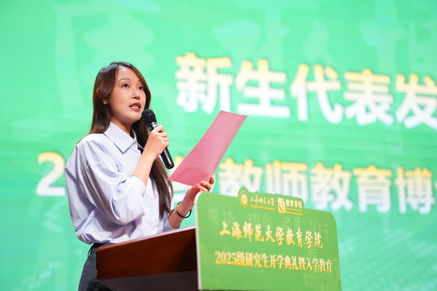 2025级教师教育专业博士生王者作为新生代表发言。她结合在师大八年的求学经历,分享了对教育使命的理解,呼吁同学们以格物致知的精神深耕科研、以融通跨界的视野探索前沿、以立德树人的理念勇担重任,在教育强国的征程中书写青春画卷。