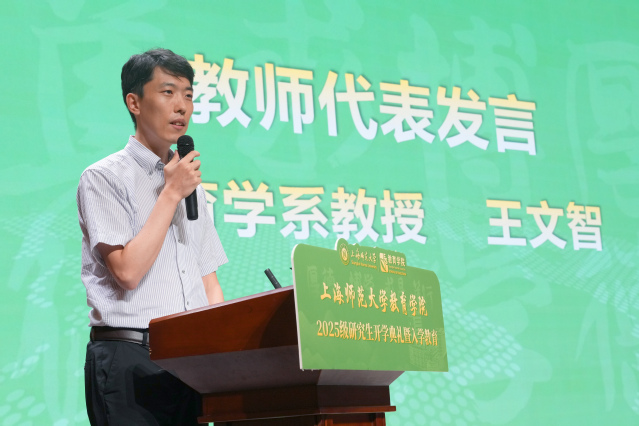 教育学系教授王文智作为教师代表发言。他以幽默而深刻的语言,探讨了人工智能时代教育研究生的价值定位,指出“人文精神与伦理判断”才是不可替代的核心竞争力,并嘱咐同学们在学术道路上与导师保持良好沟通,珍惜校园时光。