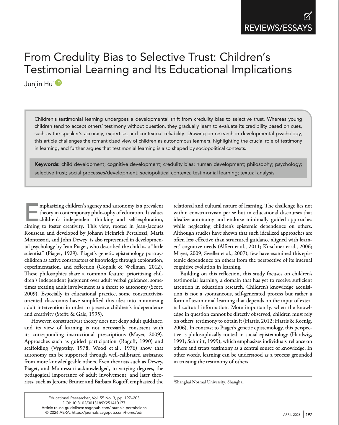 近日,我院教育学系胡君进副教授在国际知名教育期刊《Educational Researcher》2026年第3期发表题为《From Credulity Bias to Selective Trust:Children’s Testimonial Learning and Its Educational Implications》(《从轻信偏向到选择性信任:儿童的证言学习及其教育启示》)的学术论文。《Educational Researcher》(ER)是美国教育研究协会(AERA)主办的旗舰期刊。该期刊的影响因子为4.9,在JCR教育学SSCI分区中,ER位列第27/762;在中科院分区中,ER位于教育学一区TOP,属于教育学领域的国际顶级期刊,在国际教育研究界具有极高的学术声誉与广泛影响力。