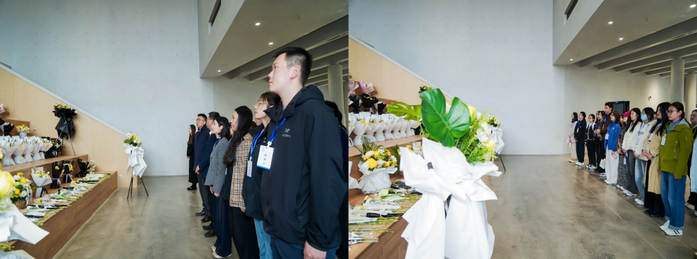 我院学生代表向于漪先生敬献鲜花,表达崇高敬意与深切缅怀。全体师生肃立默哀,以庄重简朴的仪式追思先生风范,寄托无限哀思。
